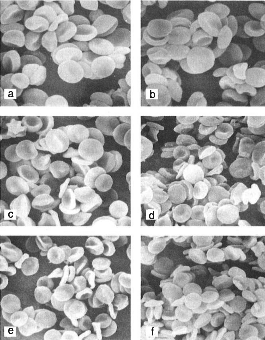 Fig. 2. Dynamics of changes in erythrocyte morphology in postnatal ontogenesis of rats: a – 1-day-old, b – 3-day-old, c – 12-day-old, d – 15-day-old, e - 21-day-old, f - adult animals. SEM. X1000