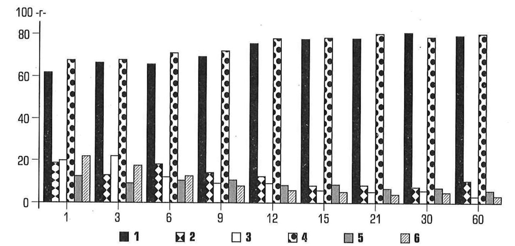 Fig. 3. Changes in erythrocyte morphology in postnatal ontogenesis of rats, whose dams were forced to swim for an hour and a half every day of their pregnancy. Horizontal axis - age of animals in days, vertical axis - number of cells in conditional units of the total amount. 1- discocytes, 2 - echinocytes, 3 - stomatocytes in reference group; 4 - discocytes, 5 - echinocytes, 6 - stomatotsity in study group.