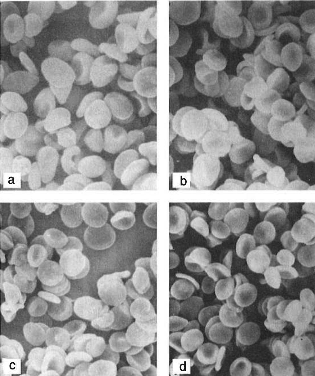 Fig. 4. Late reduction in average diameter of erythrocytes in postnatal ontogenesis of rats, whose dams were forced to swim for an hour and a half every day of their pregnancy: a – 1-day-old; b - 12-day-old; c – 21-day-old; d – 30-day-old. SEM. X1000