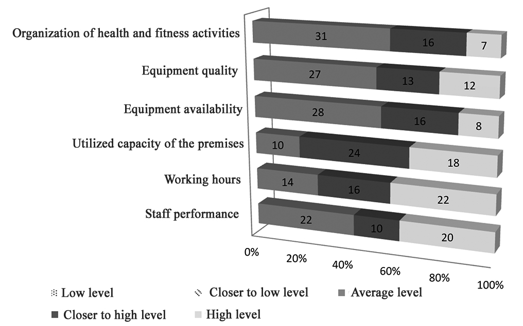 A survey of customer satisfaction with the quality of services provided at a health and fitness establishment was conducted within the framework of the competition development monitoring in the autonomous district market of sport and fitness. 52 trainees of the Youth Sports School in the town of Pokachi aged 15-50 years were surveyed. First of all, they were asked to rate the quality of service in the sport establishment by such parameters as staff performance, working hours and utilized capacity of the premises, quality and availability of special training equipment and health and fitness activities organization quality. The distribution of the respondents’ answers on a scale from “low” to “high” service quality is shown in Figure 1.