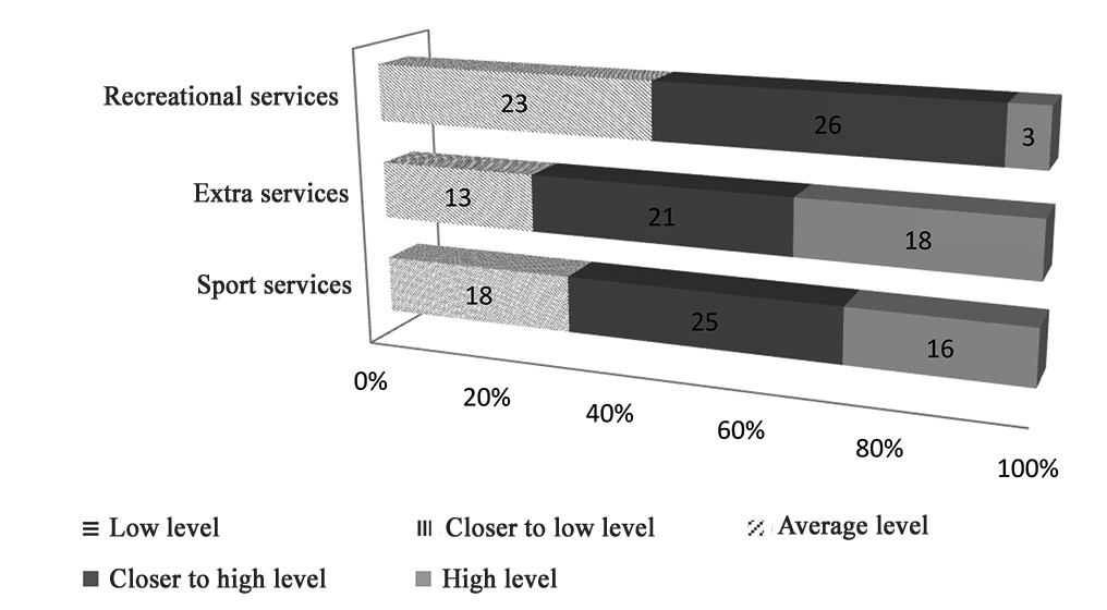 Satisfaction with the prices of the services rendered was assessed separately for three types of services: sports, extra and recreational. Indicators of customer satisfaction with the prices of rendered services are shown in Figure 2.