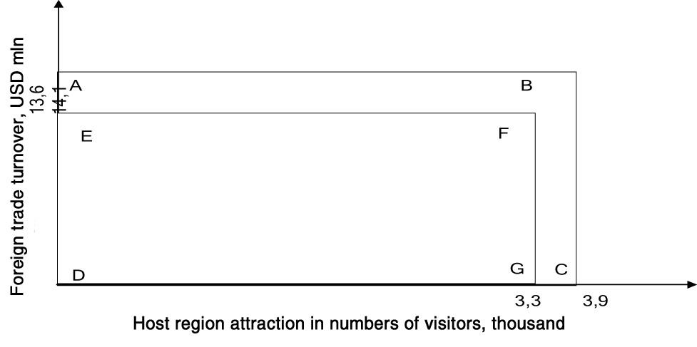 We believe that the large-scale sport events like the Olympic Games may be the key drivers for the host region positive image building. Their direct and indirect positive impacts are generally due both to the growing economic activity in the area and better perception of the host region by the people worldwide, with the improved attitudes normally followed by inflows of the national and international investments. In this study we have analysed the regional development indices versus the impacts of the large-scale sport events on the subject Krasnodar Territory to analyse and assess, among other things, the impact of the sports-specific PR projects on the host region’s image. We applied an adapted version of the A. J. Hildreth scale to process the obtained data and develop a Krasnodar Territory image rating model: see Figure 1 hereunder; with the horizontal axis showing the host region attraction as verified by the numbers of visitors; and the vertical axis – foreign trade turnover of the host region.