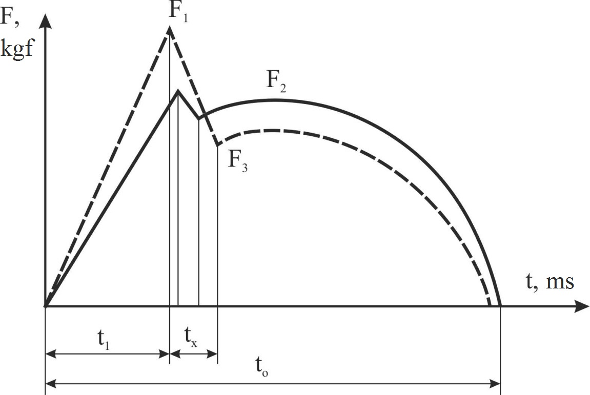 Legend: t1 – maximal force time; tx – short-term effort decay time ("switch" period in muscle work); t0 – total take-off time; F1 – efforts in the landing phase; F3 – efforts in the shock absorption phase; F2 – efforts in the active take-off phase