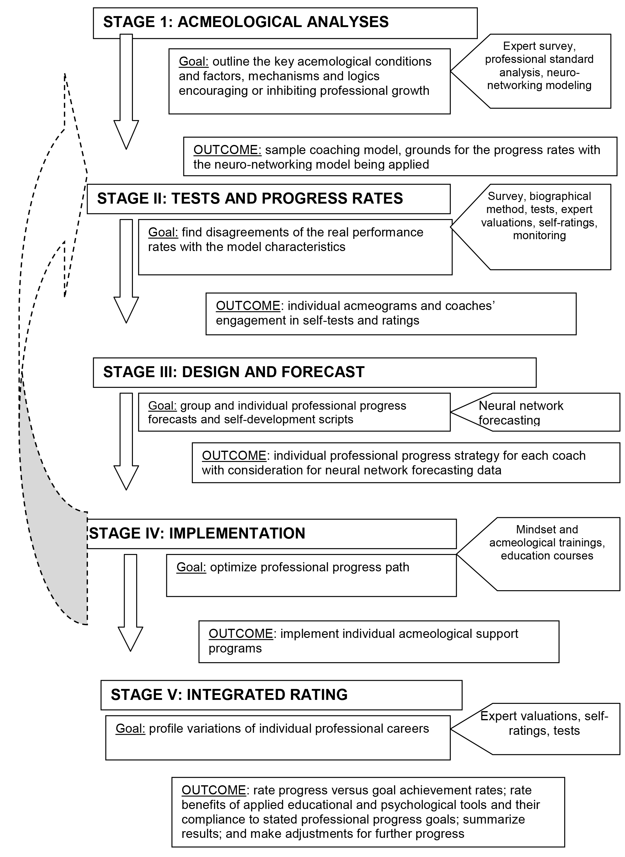 Stage I Acmeological Analyses as a component of the acmeological support process was designed to identify the key acemological conditions and factors, mechanisms and logics encouraging or inhibiting professional growth. Stage I resulted in a sample coaching model designed in compliance with the valid professional standard as verified by the relevant progress rating indicators using the neural network forecasting tools. The latter give the means to set the key progress rates - to rate the qualities, traits, abilities and competences of the trainees that are most important for their professional growth.