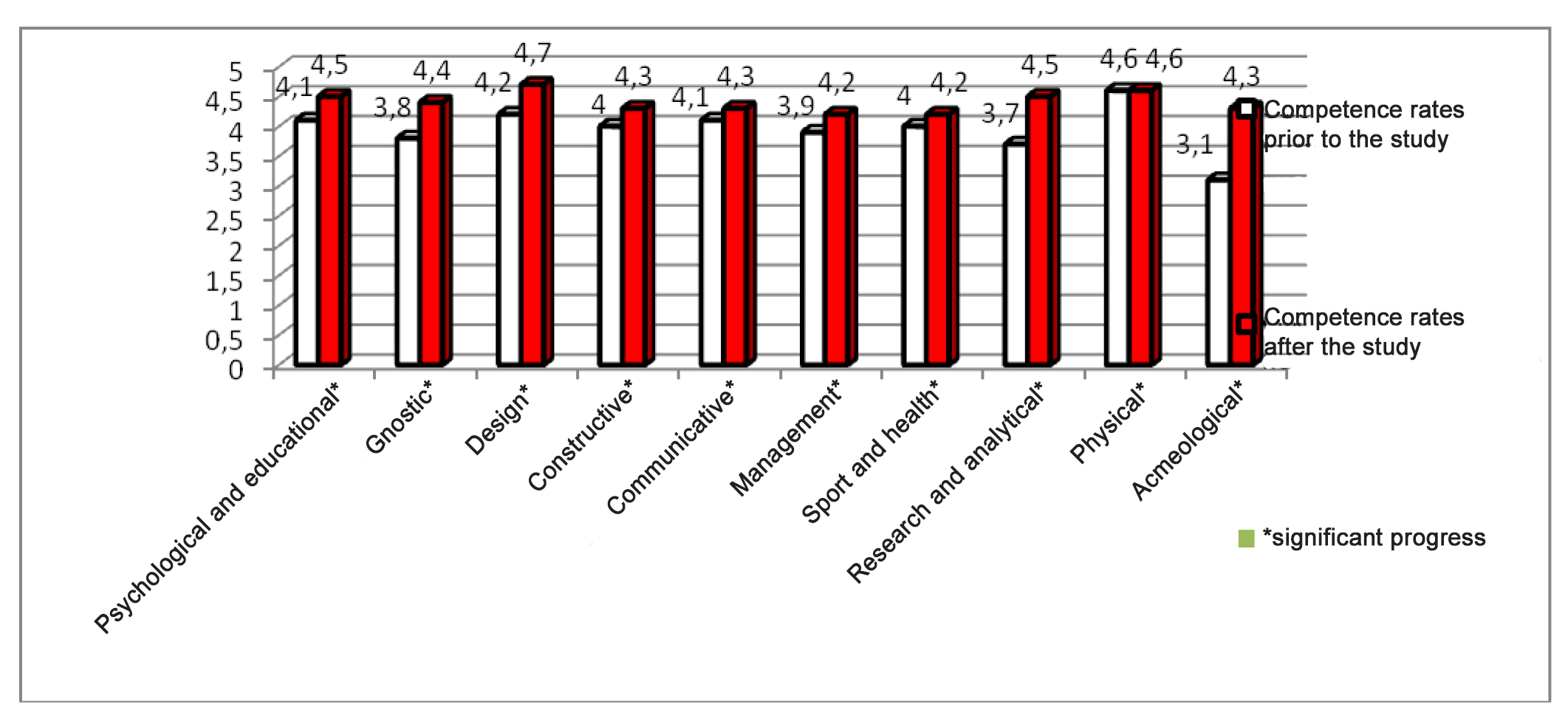 The prior and final professional competence rates of the coaches who took the advanced education course supported by the pilot acmeological system, as verified by the professional competences rating tests (using an adapted version of the M.E. Inkov’s method [3]) were indicative of the highest progress in psychological, educational, design, research, analytical and acmeological competencies (see Figure 2). As demonstrated by the study data, the most demanded prior to the advancement course were the following advanced education modules: new trends in the modern athletic training systems; biomedical provisions for sporting activity including nutrition and rehabilitation components; and athletic training process standardisation. The least demanded were the modules including self-development, professional progress aspects and own resource assessments, plus the tests and research technologies applicable in sports. Upon completion of the advanced education course, the coaches were found to give a higher priority to own professional resource discovery, individual self-development and progress profiling issues.