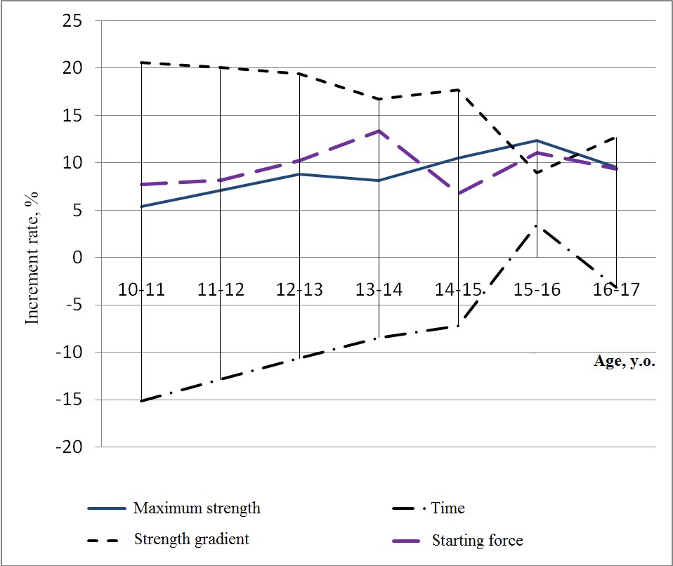 The analysis of individual increment rates in terms of the speed-strength indicators revealed the following consistent patterns. Thus, individual increment rates of the dynamometric indicators in the majority of the subjects in the period between the ages of 10 and 12 years are due to reduced effort increase time, between the ages of 14 and 17 - due to a rapid increase in the maximum strength. In the period between the ages of 12 and 14, a significant variation in the growth rate of the time and strength parameters was detected.