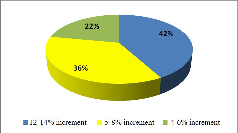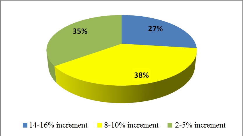 A similar distribution of the subjects of the experiment was found in terms of the maximum strength rate. 42% had high annual increment of the maximum strength, ranging from 12 to 14%. 36% of 12-14 year-old footballers had the strength increment at the average level of 5-8%. 22% of the subjects demonstrated a slight increase in the muscle strength within the annual training cycle, which was not more than 6% (Figure 3).