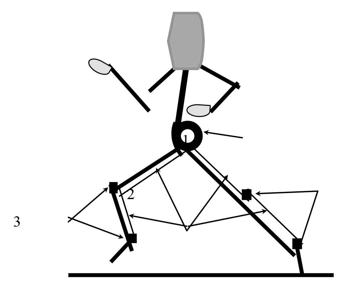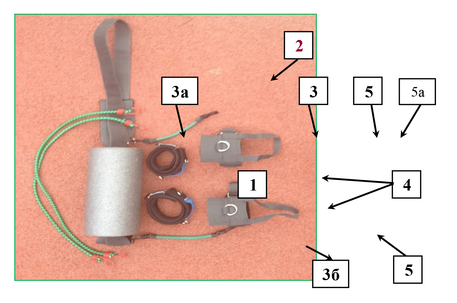 1) elastic cylinder; (2) belt (goes through the cylinder; (3) rubber shock absorbers mounted on the shin (a) or thigh (b); (4) knee straps; (5) ankle straps with (a) heel grip