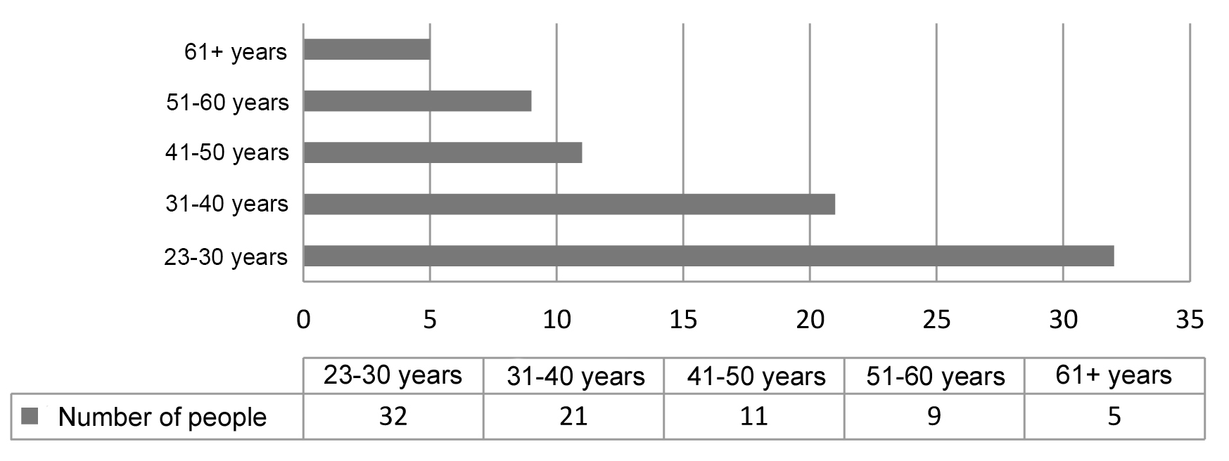 In the period of 2014-2017, the Academic Physical Education and Sport Specialist professional retraining (PR) course has been implemented in SPSU. For this time, 75 people have been trained and certified by the state Professional Retraining Diplomas; and 96% of the graduates are now employed in the national physical education and sports sector and higher education system. Data on the students’ ages and sport qualifications are given hereunder: see Figures 1 and 2.