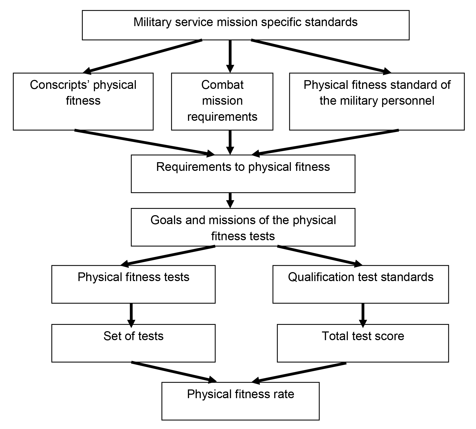 Background. Physical fitness is one of the core notions applied in the modern physical education (PE) system. Military personnel’s physical fitness may be interpreted as the physical development standard that secures the weapons and combat machinery being used in the most efficient manner with high resistance to the harmful effects of the service practice environments [2]. A set of the relevant physical fitness tests is applied to rate the personnel’s ability to fulfil the PE process missions as verified by the relevant qualitative and quantitative test criteria [3]. The service-specific physical fitness range may be quite wide unless the specific difficulty and relevance levels are determined and then the most relevant and informative tests are applied.