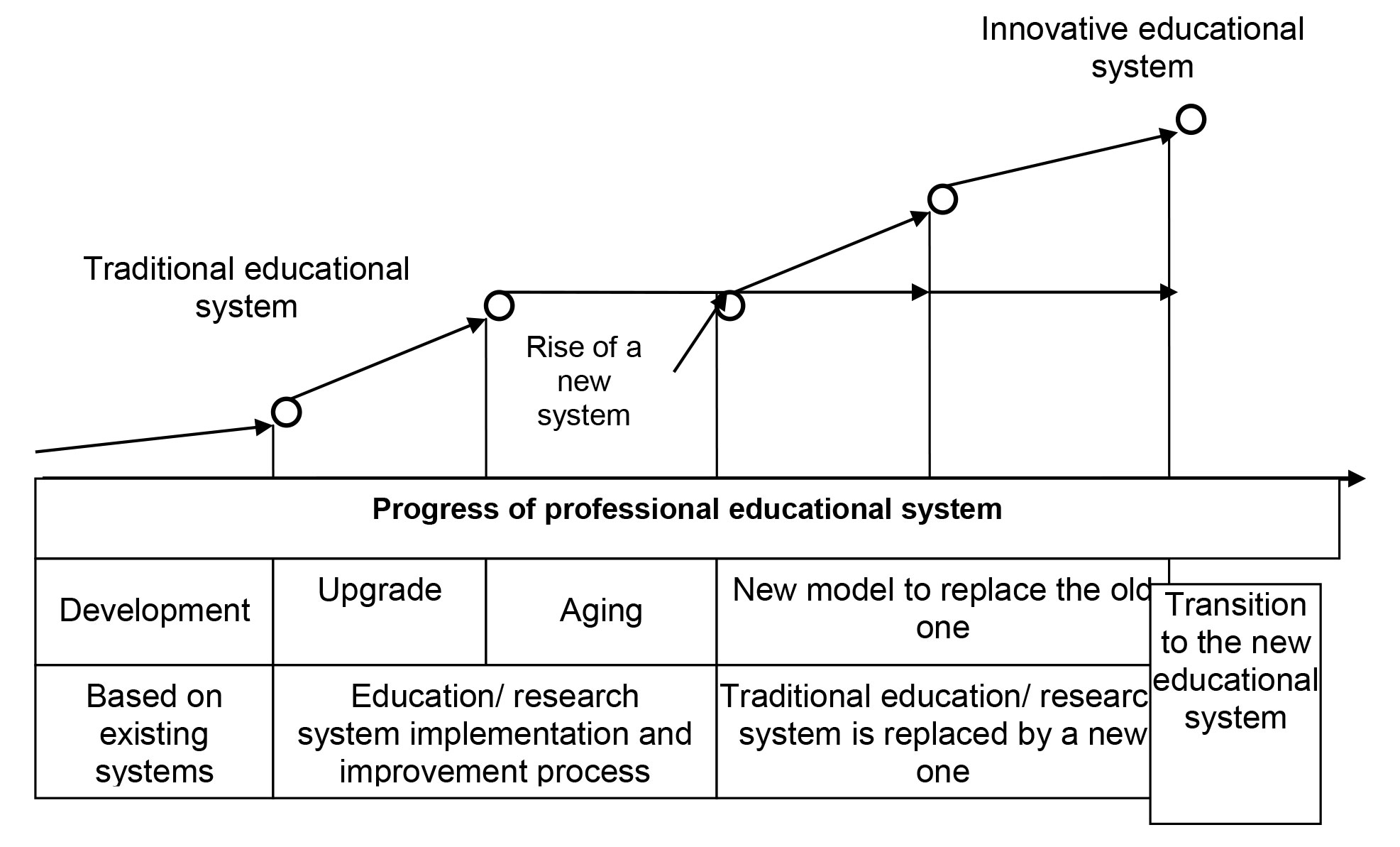 Therefore, the professional academic educational system may be at any evolutionary stage (including initial, progress, peaking, stagnation, degradation and extinction stages) as dictated by a variety of factors, conditions and aspects.