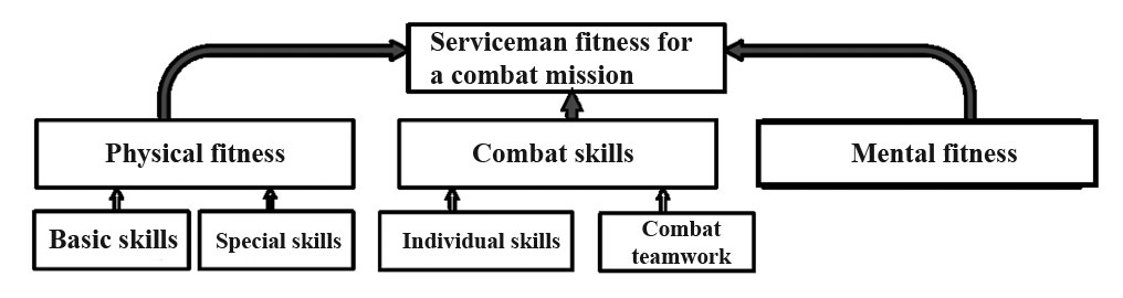 Presently a special priority is being given to the service personnel fitness/ skills for success of the antiterrorist operation albeit the individual fitness rating criteria still need to be agreed upon, categorized and standardized. Analysis of the practical provisions for and actual personnel performance in the antiterrorist operations gives the grounds for the provisional conclusion that a success in the combat mission depends on a variety of personality qualities including: perfect combat skills; high mental control ability; high physical fitness; and practical skills and abilities for combat missions in a wide range of climatic and geographic conditions [5]. These qualities and skills may be formed and improved, within certain individual limits, by special physical training systems [6] designed to make a serviceman physically and mentally fit for the combat missions in the antiterrorist operations: see Figure 1 hereunder.
