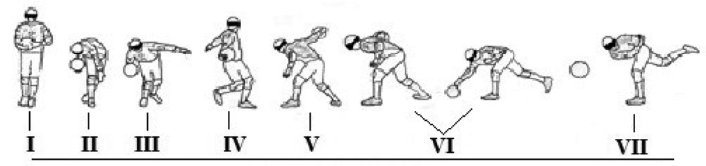 Run one-hand shot is arguably the most popular shot in goalball. It may be basically classified into the two-four-step 3-plus meter and run 6-plus meter shots; with the latter (long-range) shots made mostly by the highly technically and tactically skilled and experienced players. Run one-hand shot implies the player being skilled enough to control the run and shot with no violation of the goalball rules item 24 [4] that requires that the ball should touch the court at least once in a point 6-plus meters afar from the goal otherwise the violation is fixed and penalized. The shooting player must return to defense as soon as possible for the reason that he/she is often attacked right after the shot as presumably the least ready for defense. Given on Figure 3 hereunder are the run one-hand shot phases: 1 – Starting position; 2 – First strides and preparation; 3 – Dead point; 4 – Swing up and final strides; 5 – Stretched bow phase; 6 – Final action; 7 – Shot follow-up phase.