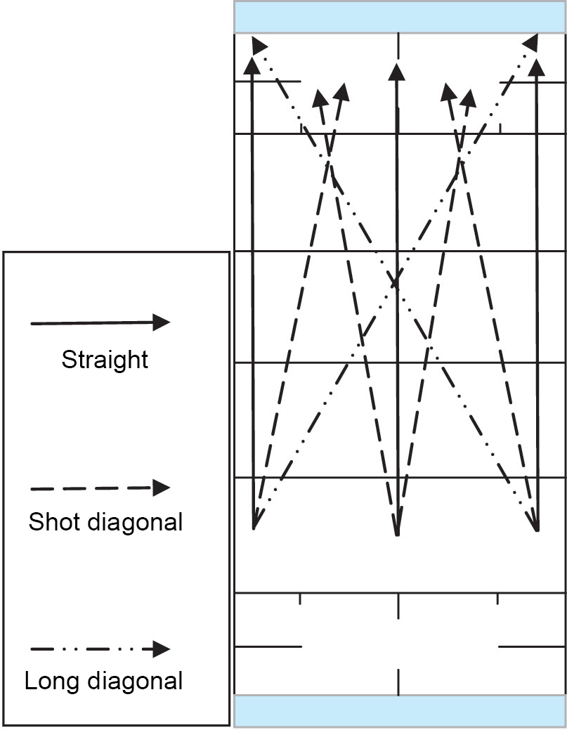 Furthermore, goalball shots may be classified by the shot ranges and directions. In beginner goalball, long shots are made from own gates or 1.5m line; mid-range shots are made from 3m line, and the closest shots are made from the 6m line. The shots may be further classified into straight, shot diagonal and long diagonal shots: see Figure 5.