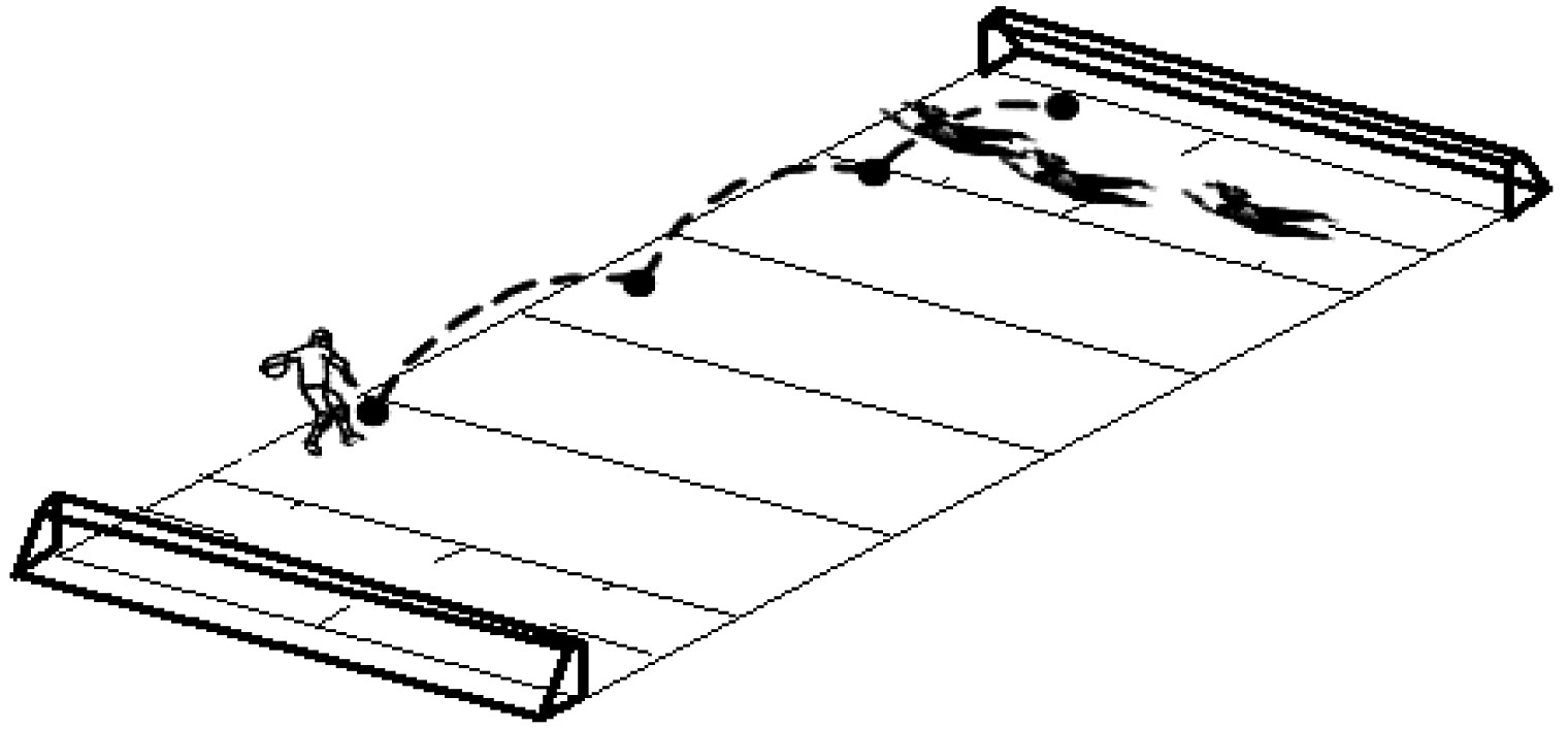 Goalball shots may be further classified into slide and bounce shots. The slide shots are dictated by the game tactics to score fast and unexpectedly for the opponent, with the ball shot with maximal speed. The bounce shot is designed to distract the opponent and send it over the defense: see Figure 6.