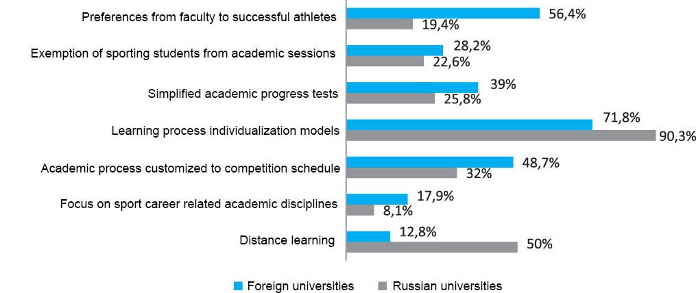 Study findings and discussion. As was found in the elite student-athletes’ questionnaire survey, they give a higher priority to competitive accomplishments than to academic progress and high-quality education [1]; and, hence, universities have to compete with sport clubs and coaching teams trying to motivate their students for education. As reported by the Russian sample, when the coaches or clubs are reluctant to effectively cooperate with universities in the academic process customizing issues, this may be a serious barrier for the academic progress of the students who are more focused on their athletic careers. This means that no attempt to effectively customize the academic educational process to the sporting needs of an elite athlete may be successful enough unless supported by due cooperation of the sport club management, sport agent, coaching team etc. with the university.
