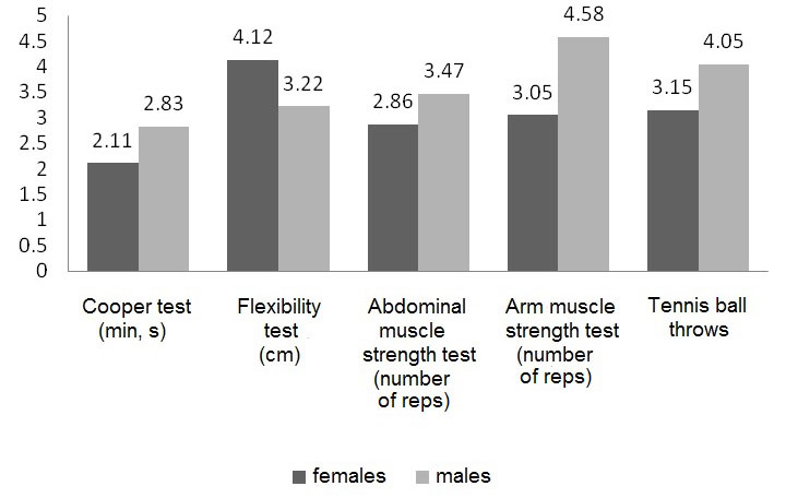 High intra-group variability was detected in strength and endurance-rating tests,. In the sit-up test (number of sit-ups from a supine position per 1 min), with the mean value being 20+1 number of reps, the girls’ minimum and maximum results were 10 and 47, respectively. The boys’ minimum and maximum values equaled 20 and 51, respectively, with the mean value being 30+1 number of reps.