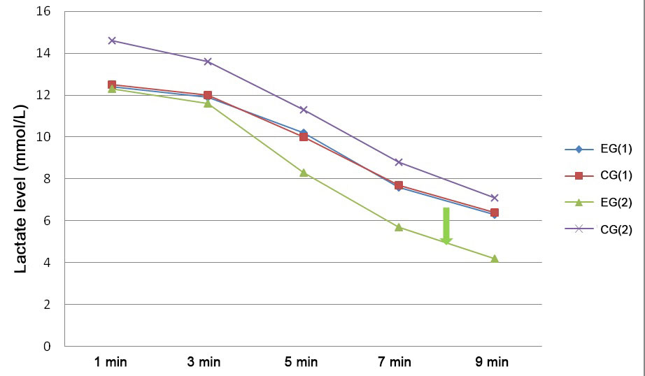 When considering the recovery period after the "4x50m" race at maximum speed and a 15s interval, we detected considerable differences between the EG and RG athletes. As seen from Figure 2, the lactate level after the swimming race was significantly lower in the EG swimmers than in the RG ones. At the same time, the EG athletes were found to have blood lactate restored more intensively starting from the 3rd minute of rest.