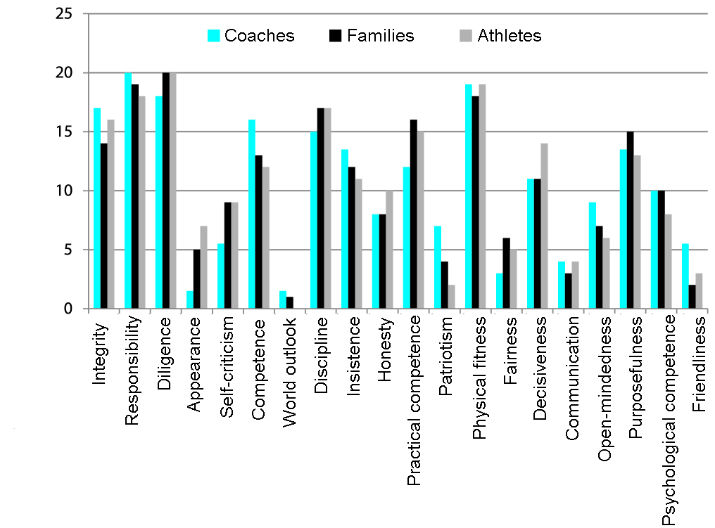 The best personality qualities of a successful athlete, in opinions of the coaches, families and athletes, include diligence, responsibility, physical fitness and discipline; with the athletes and families ranking diligence on top of the list in contrast to the coaches who prioritize responsibility. The athletes and families were also found to rank mental fitness higher than the coaches: see Figure 2.