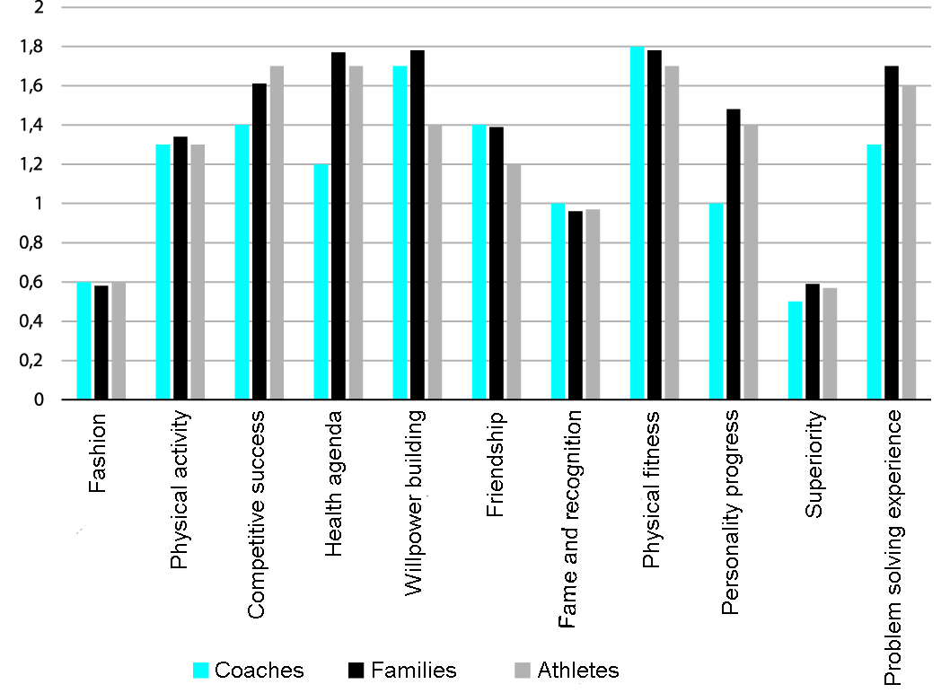 The athlete’s key progress motivations, in opinions of the coaches, families and athletes, are dominated by physical progress, willpower building and competitive success motivations. It is important that both the families and athletes mention the ‘health agenda’ and ‘problem solving experience’ among the key motivations for the trainings and progress: see Figure 3.